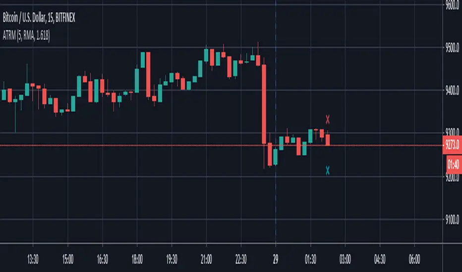 Plots crosses above and below the current price giving you the ability to quickly set your stop loss (or the 1st profit target) depending on a custom variable by which the average true range is multiplied with the option to specify the length as well as the type of the moving average (RMA, SMA, EMA or WMA) that are taking into account.