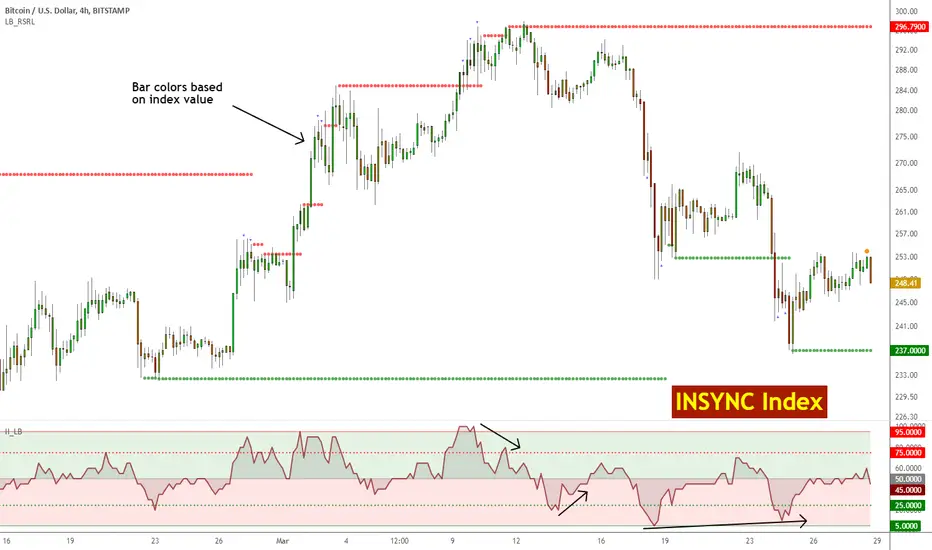 Levels 75/25 are early warning levels. Note that, index > 75 (and less than 95) should be considered very bullish and index below 25 (but above 5) as very bearish. Levels 95/5 are equivalent to traditional OB/OS levels.