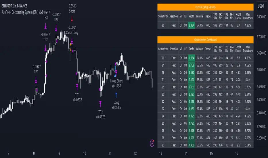 The Backtesting System (SM) excels in pinpointing the optimal settings for the RunRox - Signals Master indicator, efficiently highlighting the most effective configurations.