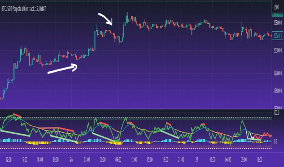 The divergences of an indicator can be extremely useful in catching scalp opportunities, a DARK RED/GREEN represents a REGULAR divergence, while a SALMON/LIGHT GREEN color represents a HIDDEN divergence.