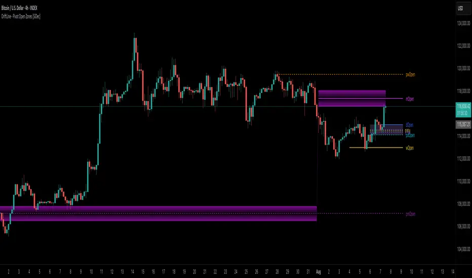 - Optional % distance labels — letting you instantly see how stretched or compressed price is relative to key opens.