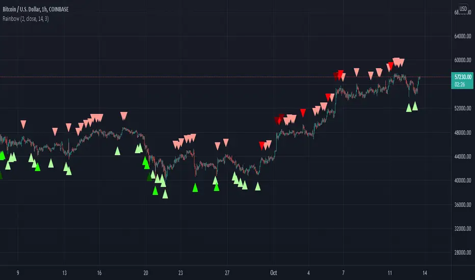 When the RSI is between 40 and 60 no fractals are posted. Lighter colored fractals are closer to a RSI value of 50 and darker fractals or further away from a RSI value of 50.