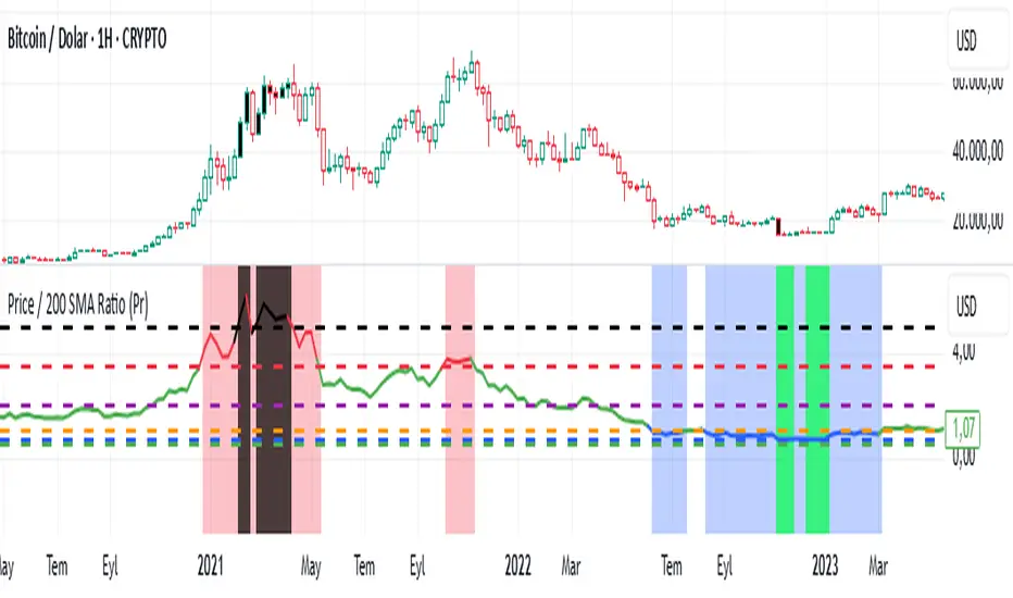 Blue: When the ratio is less than 1, the price is below the 200 SMA, indicating that the market may be in an oversold condition.