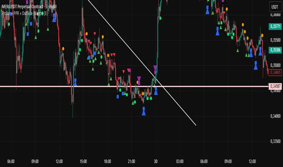 This script is a comprehensive pattern detector for trading charts. It identifies three types of candlestick patterns: PinBar, PPR, and OutSide (Engulfing) bars.