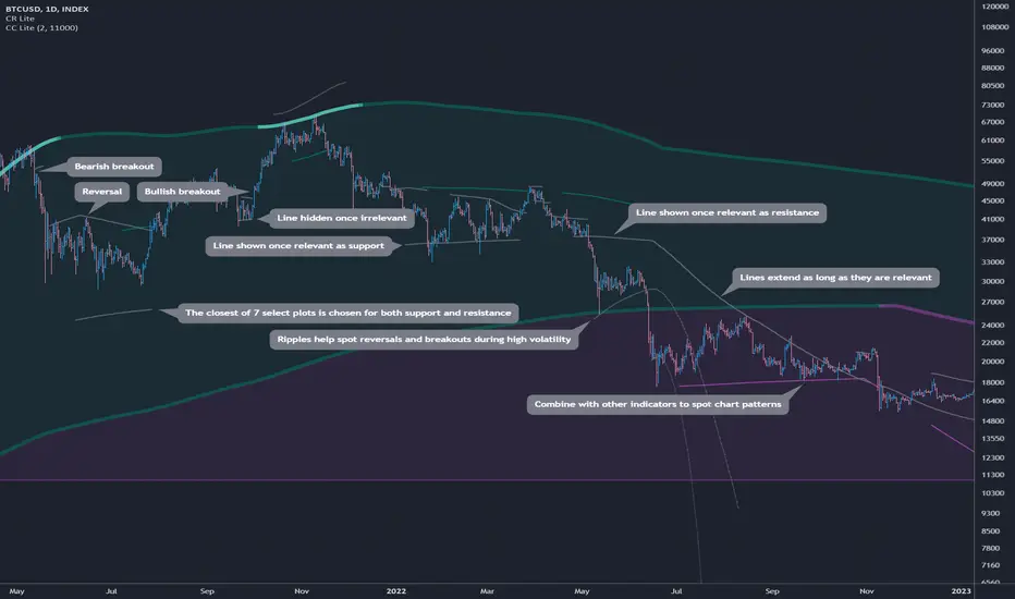 Cosmic Rays Lite compresses 14 moving averages of varying type and length into 7 plots and filters those down into the closest support and resistance lines. When the price moves above final resistance or below final support, additional "ripple" lines are appended using aggregate standard deviation multiples. The visibility of each line is toggled depending on its stability and its proximity to the price.
