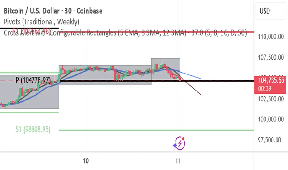 This TradingView script, **"Cross Alert with Configurable Rectangles"**, is a technical analysis tool designed to help traders visualize and analyze market trends effectively. It combines configurable moving averages with customizable timeframe-based rectangles for highlighting price ranges.
