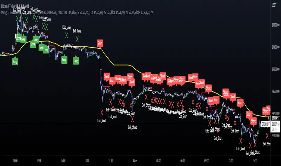 Exits are provided for both directions, long and short, when the SuperTrend Oscillator (ST OSC) hits maximum (+100/-100).