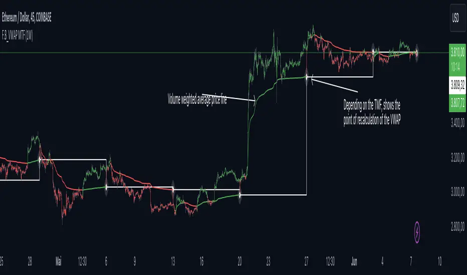 The F.B_Volume Weighted Average Price MTF (VWAP MTF) indicator calculates the volume-weighted average price of a security across different timeframes. The VWAP is a powerful indicator used by both institutional and retail traders to make better trading decisions.