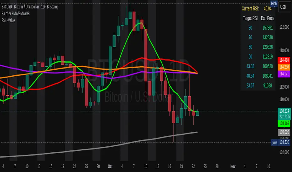 This indicator calculates the current RSI based on the closing price and projects estimated prices for user-defined RSI target levels. Results are displayed in a table at the top-right corner of the chart.