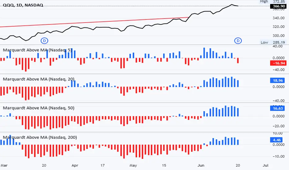 Breadth indicator showing % stocks above various moving averages. Histogram is positive (blue) when % stocks above selected MA is greater than 50%. Histogram is negative (red) when % of stocks above selected MA is less than 50%. Data manipulation causes the actual % value in y-axis to be incorrect but enhances visualization. Actual %'s are simply the displayed values + 50.