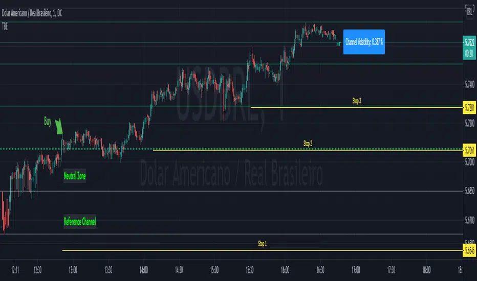 This indicator calculates the distance between the top and the bottom. This distance is projected equally above the top and below the bottom. The distance used between the top and bottom is called the reference channel and the first distance above or below the reference channel is called the neutral zone. Buying and selling occurs when the support is lost or the resistance breaks in the neutral zone. It is possible to follow trends through this indicator and maintain a safe position with stop.