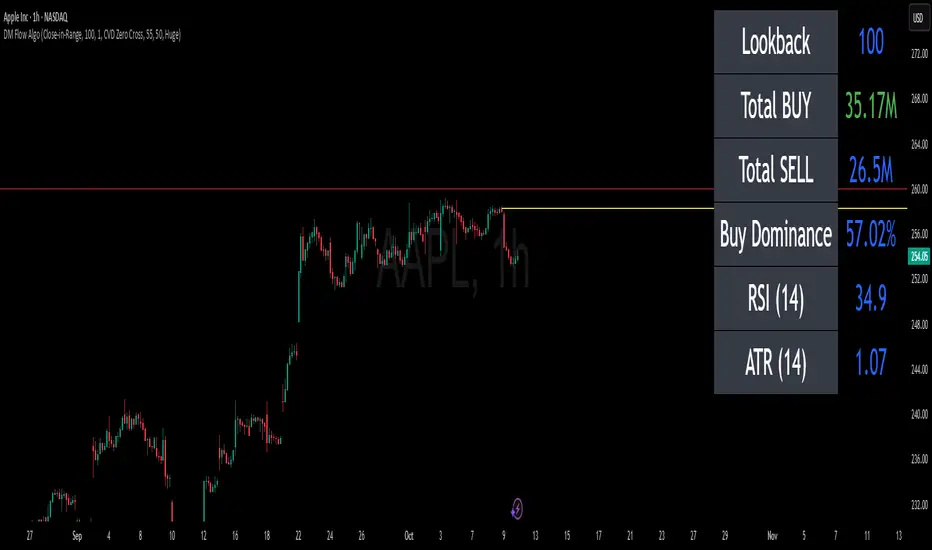 DM Flow Algo is a volume-based flow analysis tool that compares buying vs. selling pressure in the market over a rolling window of bars.