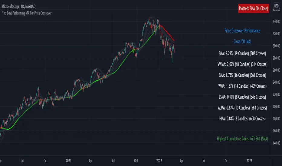 The script calculates the average number of candles that the source (i.e. close, open, low, ohlc4) remains above the moving average until crossing back under, in addition to the number of crosses. Performance is listed from best to worst; descending order. Also listed is the HIGHEST cumulative gains of ALL tested moving averages.