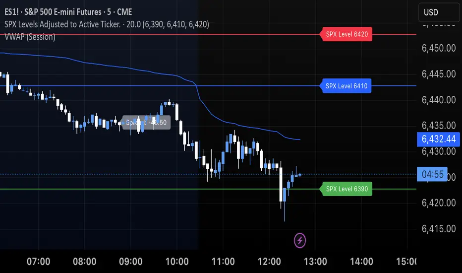 This indicator allows you to plot custom SPX levels directly on the ES1! (E-mini S&P 500 Futures) chart, automatically adjusting for the spread between SPX and ES1!. This is particularly useful for traders who perform technical analysis on SPX but execute trades on ES1!.Features: