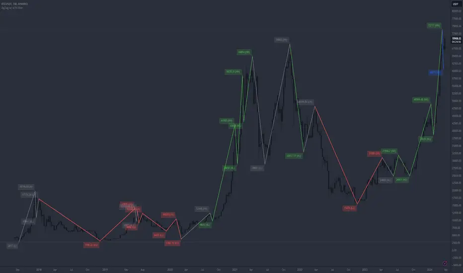The typical ZigZag indicator, which connects pivot points (see TradingView's Help Center regarding their indicator Pivot Points High Low, for an in depth explanation on how they are calculated) with lines, except instead of a percentage threshold, it uses ATR which adjusts for volatility of the ticker you are viewing. The ZigZag indicator can therefore be used to help visualise price legs and trends on a usually noisy looking chart.