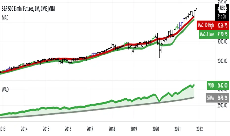 We all know that moving averages, in particular, moving averages of closing prices tend to be highly inaccurate indicators and frequently miss major tops and bottoms. In backtesting, they tend to be accurate some 30 to 40% of the time which is to my way of thinking unacceptable. On the contrary moving averages of opens versus closes for highs versus lows, when used properly avoid the drawbacks of closing moving averages, particularly when combined with a trigger. Shown above is my moving average channel method which uses the 57 SMA of Williams accumulation distribution as a setup or trigger. As shown by the arrows two consecutive price bars completely below the MA channel low and triggered by Williams below SMA constitutes a sell signal. Conversely, two consecutive price bars or more above the moving average channel high accompanied by Williams above its moving average constitutes a sell trigger. The moving average channel high, the red line is a 10 period Moving average of highs. The Moving average channel low, the green line is an 8 period Moving average of the low. There are at least a dozen applications of this methodology including its ability to spot trend changes, support, resistance, swing trades, market strength, market weakness, and more. I will post some of these additional uses of the moving average channel as they present themselves. Do note that in this chart there were two instances above the moving average channel high but these were not triggered by Williams AD and therefore the trend remains down for the duration of this chart. The methodology associated with my MAC is completely rules-based and works in any timeframe. Thank you my friend Larry Williams for developing your excellent version of accumulation-distribution