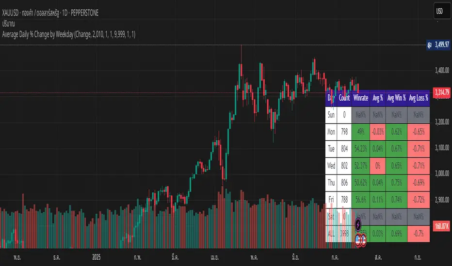 Update: "Average Daily % Change by Weekday" Indicator v3- Added a new Mode selection input: Choose between "% Change" and absolute "Price Change" (close - open).