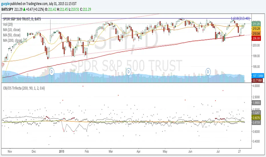 After reading Cam Hui's blog post about his "Trifecta" bottom spotting model I thought I'd try my hand at scripting it as an indicator. The results are pretty close to what he describes. Though the data TradingView feeds me doesn't seem to be identical to what he's using on StockCharts.com the results are close enough that I will call the effort a success worth publishing.