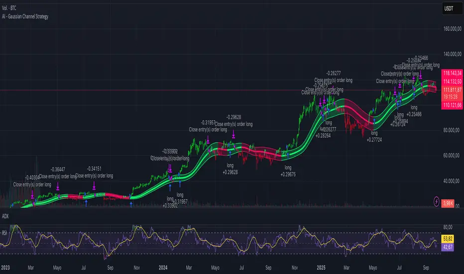 AI – Gaussian Channel Strategy is a long-only swing trading strategy designed for Bitcoin and other assets on daily charts. It combines an adaptive Gaussian Channel with Supertrend and Stochastic RSI filters to identify potential bullish breakouts or pullback entries. The channel defines trend direction and volatility, while the Stochastic RSI provides momentum confirmation. Positions are opened only when the price closes above the channel’s upper band under favorable momentum conditions, and are closed when the price crosses back below the band.