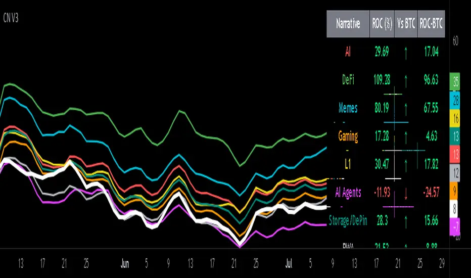 Simple Indicator that displays the relative strength of 8 Key narratives as "Spaghetti" chart against BTC as a base. The indicator includes an optional table of ROC values . The spaghetti chart plots an aggregated RSI value over a selectable timeframe for the 5 highest Market Cap cryptocurrencies within each of the 8 narratives. The chart plots a 14 period SMA RSI for each narrative.Functionality: