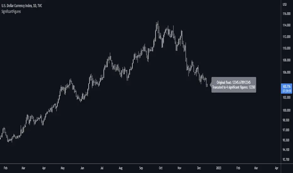description Takes a floating-point number - one that can, but doesn't have to, include a decimal point - and converts it to a floating-point number with only a certain number of digits left. For example, say you want to display a variable from your script to the user and it comes out to something like 45.366666666666666666666667 or whatever. That looks awful when you, for example, print it in a label. Now you could round it up to the nearest integer easily using a built-in function, or even to a certain number of decimal places using a reasonably simple custom function. But that's a bit arbitrary. Suppose you don't know what asset the script will be used on, and so you can't predict what the price is, and what the value will turn out to be. It could be 0.00045366666666666666666666667 instead. Now if you round it up to 3 decimal places it comes out as 0.000, which is useless. My function will round that number to 0.0004536 instead, if told to do it to 4 significant digits.
