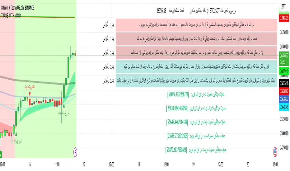 This indicator is used to identify the trend through the background color and by using the MACD indicator information and summarizing the moving average information and identifying the trend through the integration of information and then warning the fall and growth of the price of Bitcoin relative to the successful entry into any transaction by the trader. it helps
