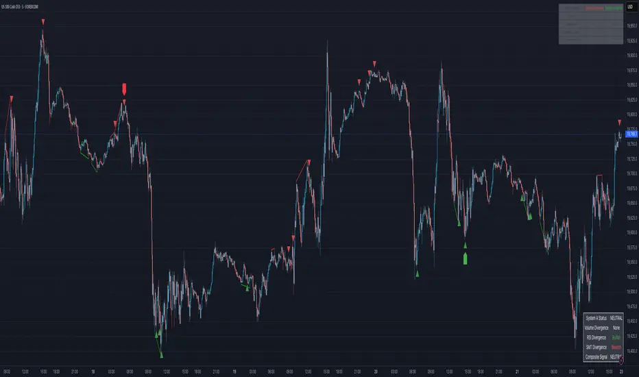This indicator provides multiple layers of market analysis through its integrated approach. By understanding each component's function and how they work together, you can develop a nuanced trading strategy that takes advantage of high-probability reversal and divergence setups across various market conditions.