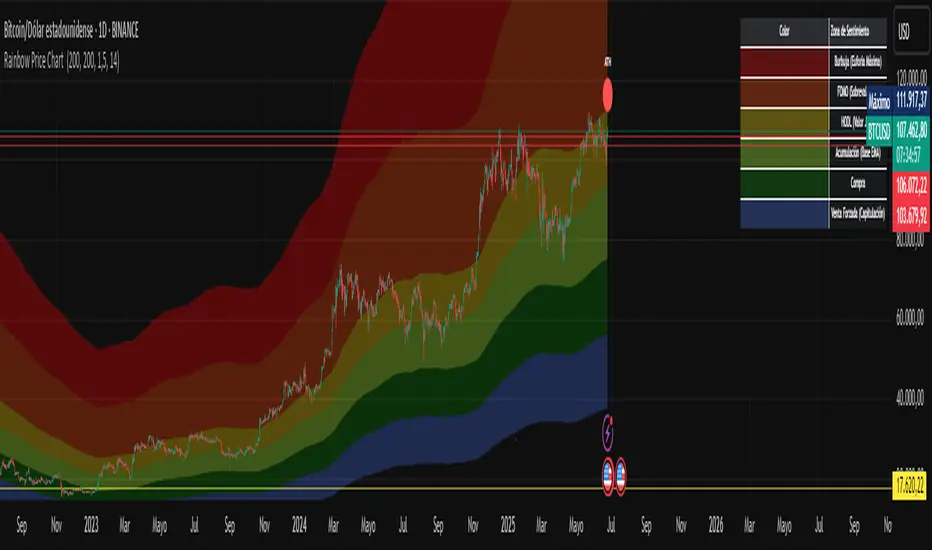 It combines two popular methodologies for visualizing Bitcoin's value and sentiment: the classic "Rainbow Price Chart" and signals derived from the "Value per Transaction Ratio" (V/T Ratio) based on blockchain data. It is ideal for long-term investors looking for strategic entry/exit points.