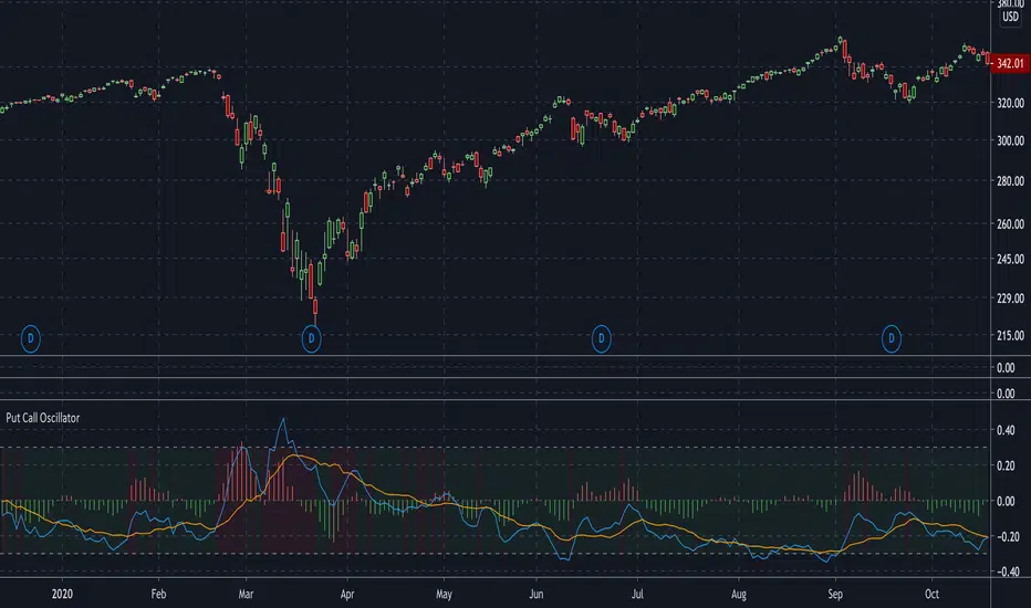 This plots two moving averages of the CBOE S&P500 PCR (put call ratio), and a histogram to measure the distance between them. The histogram will generate signals of green (bullish) or red (bearish), depending on whether put volume is decreasing or increasing.