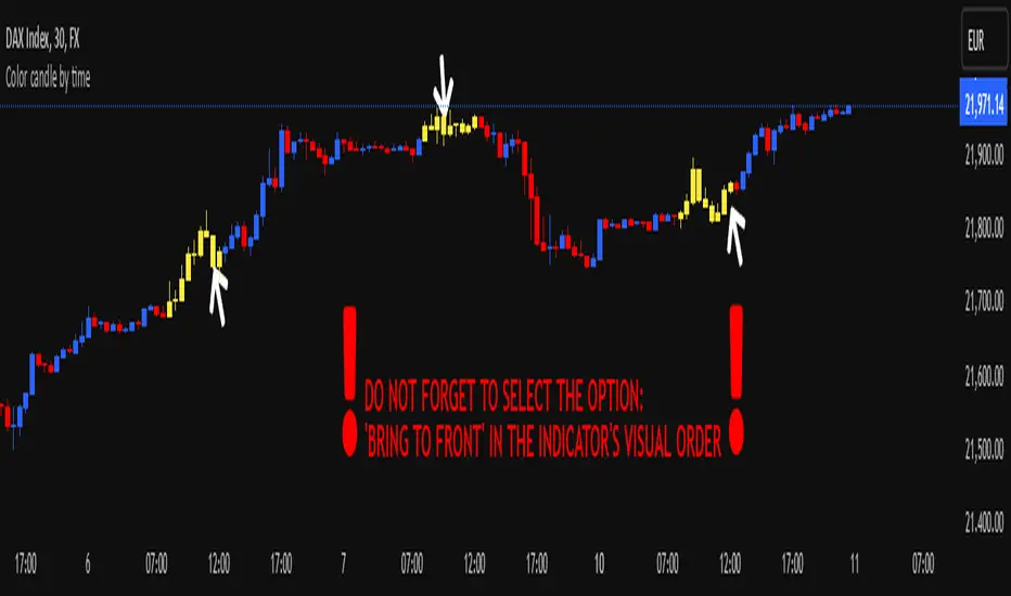 This indicator, written in Pine Script v5, allows you to highlight candles (using a user-selected color) that fall within a user-defined time range. Candles outside this range maintain their original appearance.