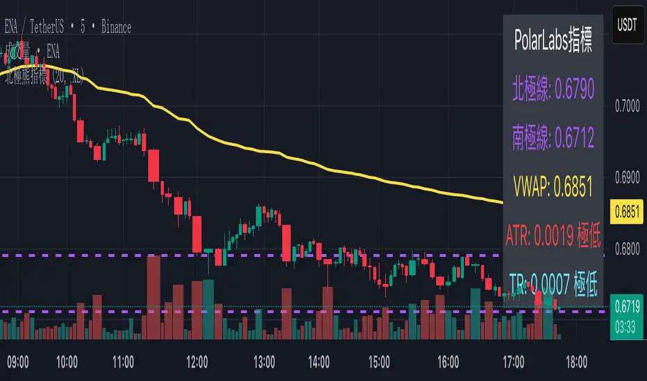 北极熊指标能够自动侦测近期的“北极线”(压力线)与“南极线”(支撑线),并整合VWAP、ATR、TR等关键数据,在图表右上角以面板形式直观展示。无论是箱体震荡、网格套利、趋势跟踪还是全自动量化策略,本指标都能为你的交易分析提供有力支持。