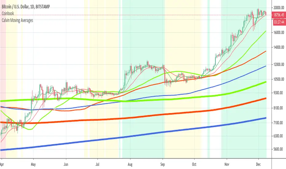 This is Coinbook's major indicator complete with red, yellow, and green zones. The major moving averages are also displayed.