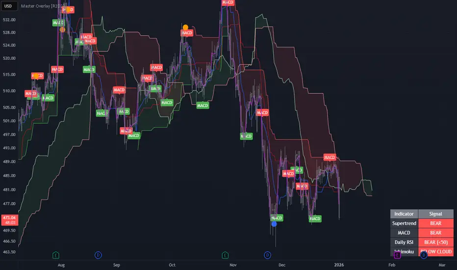 Instead of cluttering your chart with multiple sub-windows (which shrinks your view of the price), this script uses smart overlays and a data dashboard to provide actionable data instantly. It is optimized for the Daily timeframe as requested, but functions on all timeframes.