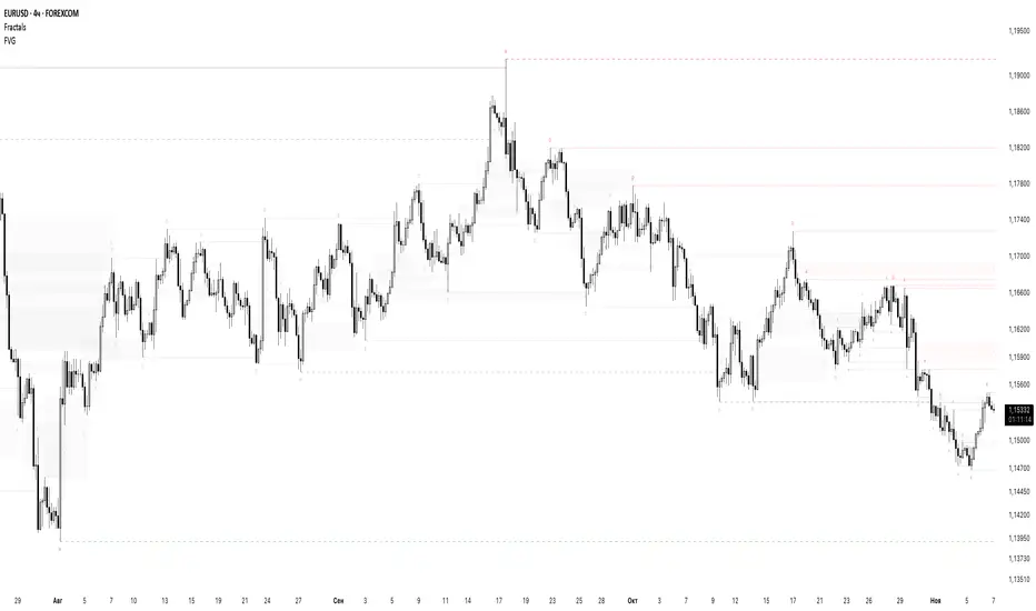 The indicator automatically detects fractals and imbalances on selected timeframes.