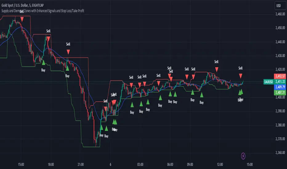 This Pine Script indicator combines supply and demand zone analysis with dynamic buy/sell signals to enhance trading strategies. It provides a robust framework for identifying optimal trading opportunities and managing existing trades.