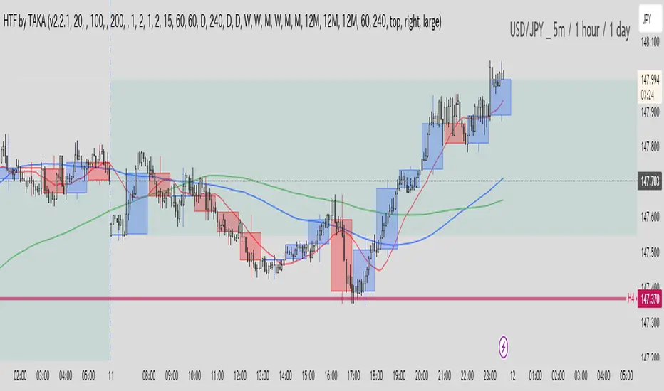 The TAKA (Timeframe Adjustment Kasane Ashi) indicator was inspired by the "HTF Candles" script (created by "informanerd") and TradingView's built-in script "Multi-Time Period Charts." This script provides a highly customizable interface that allows users to overlay higher timeframe candlesticks onto the current chart. You can easily adjust the timeframe, candle type, and styling options for the body, borders, and wicks.
