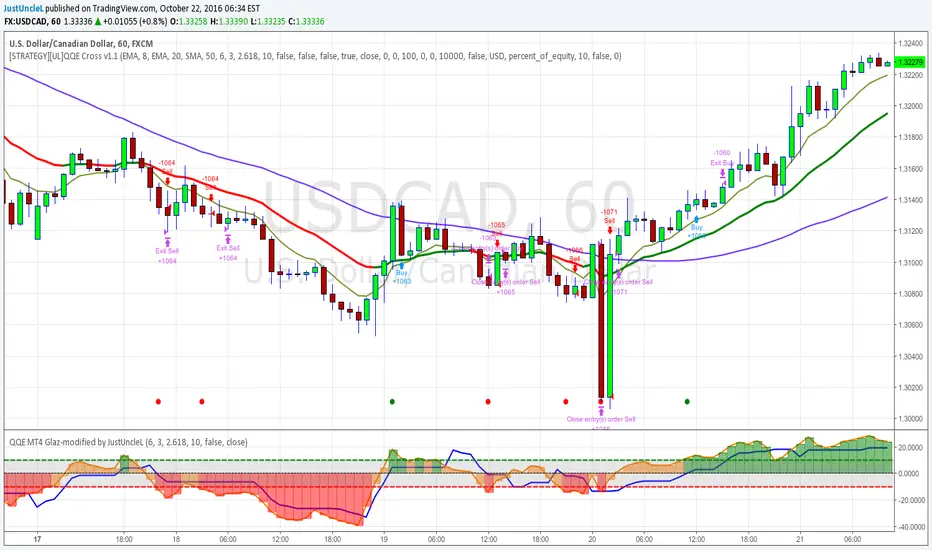 Updated by request: this is a "Strategy" trading version of the "QQE Cross Indicator Alert v2.0 by JustUncleL" (which is mainly for Binary Options trading), the same BUY/SELL signals are used to generate trade entry and exit conditions. Thanks again to JayRogers for making the Strategy risk management easier to understand and implement.