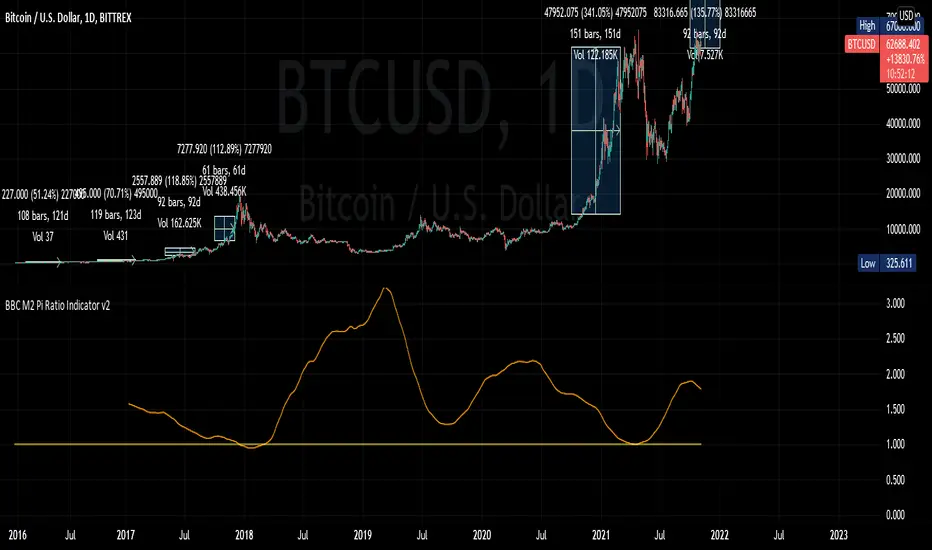 Pi Cycle indicator expressed as a ratio such that when the indicator triggers (350DMA *2 = 111DMA) the ratio will be 1. This allows you to place an alert on the ratio line for crossing certain thresholds such as 1.1.