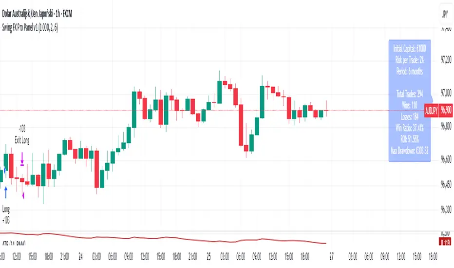 "Swing FX Pro Panel v1" is a professional swing trading strategy tailored for the Forex market and other highly liquid assets. The core logic is based on the crossover of two Exponential Moving Averages (EMA), allowing the strategy to detect trend shifts and generate precise entry signals.