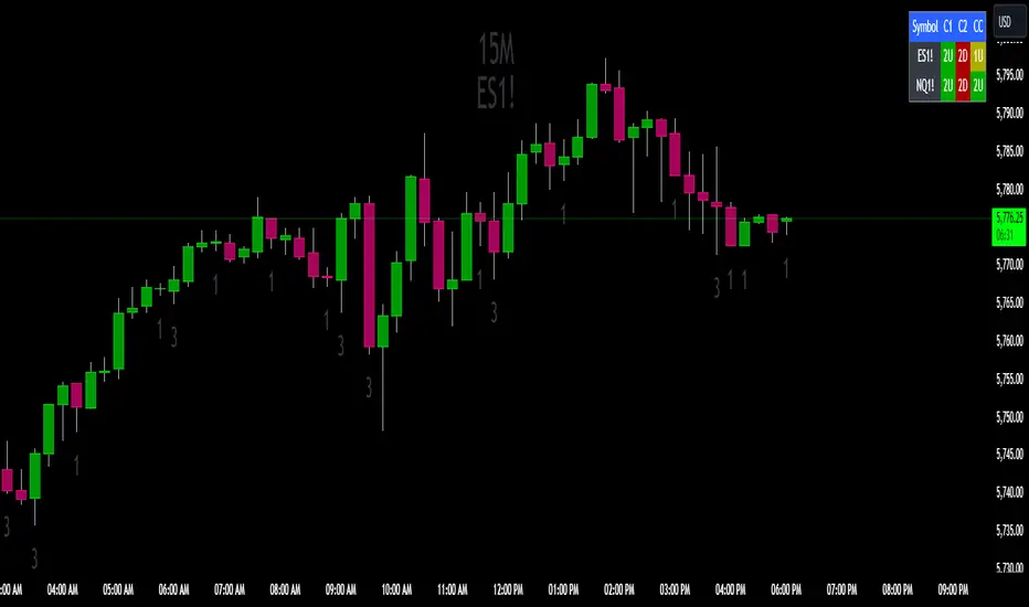 Each state is dynamically updated based on the actual price action and whether the candle closes above or below the open. Conflict candles (like a 2-up closing red or 2-down closing green) are highlighted, making it easier to spot potential reversals or weakness in the trend.