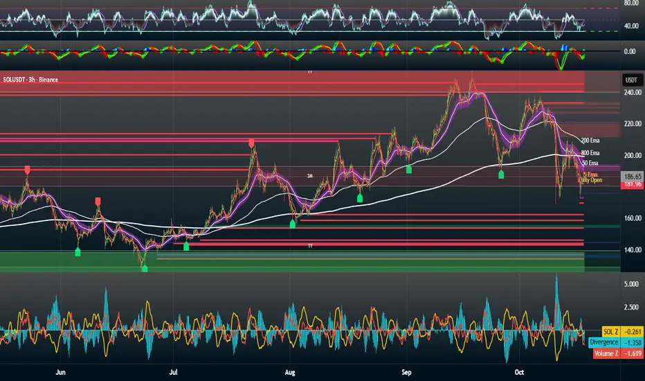 This is an indicator that I designed to compare Solana’s price momentum with aggregated NFT market activity. It converts both into standardized z-scores for direct comparison, then measures their divergence. The resulting signal highlights when NFT trading activity begins to move ahead of, or behind, SOL price action.