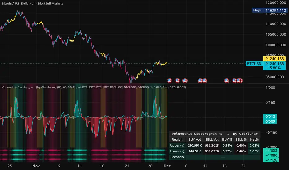 Volumetric Spectrogram [by Oberlunar] is a binned volume “spectrogram” that separates buy/sell pressure above vs below the current price and summarises it with two oscillators. Includes optional multi-feed (broker/exchange) aggregation, delta-based colouring, and a sideways compression marker.