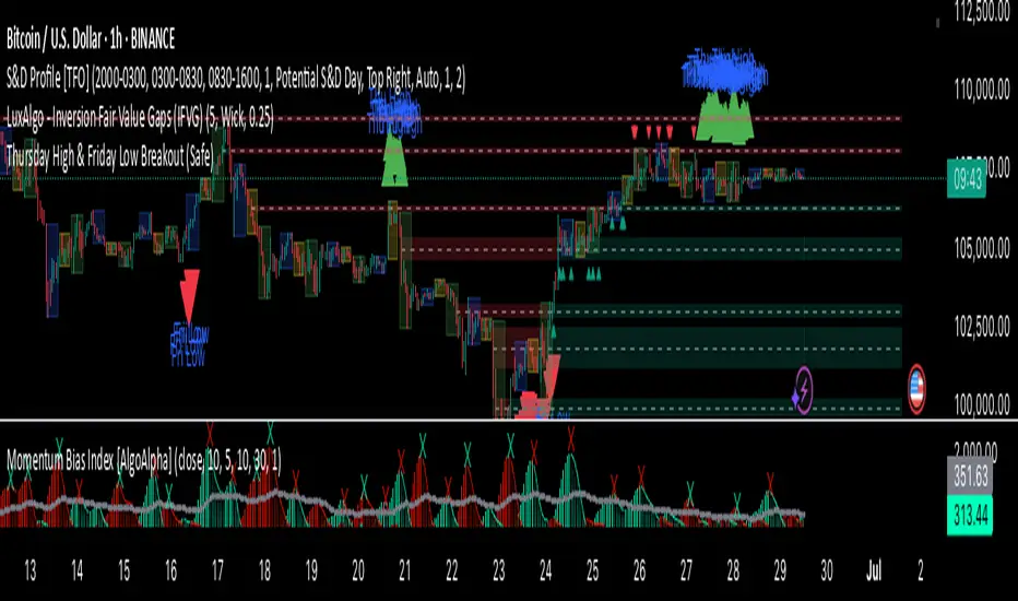 The indicator is best used on 1H, 4H, or daily timeframes to clearly observe the Thursday–Friday–Monday structure. It works well in both trending and consolidating markets as a tool to mark potential liquidity sweeps or break-of-structure setups.