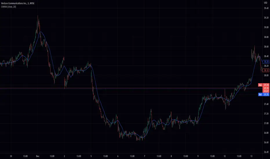 The script then specifies the input parameters for the cwma function: the source data (close) and the moving average length (length). It then plots the custom weighted moving average on the chart.
