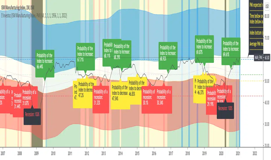 In the chart you will see a figure over the probability for a recession, a slowdown that could lead to a recession and the probability for increased productivity. That may help when you consider when to buy or sell. You can also read about how long time the PMI index has been in each and every zone and also see the average for the index.