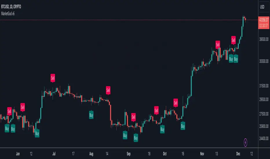Advance your trading game by applying our TA based indicator-study on your charts. Market God v6 is a tool that can be added to any chart, timeframe, or ticker on tradingview.com, and suggests the situation at hand as an opportunity to buy or sell you interests.