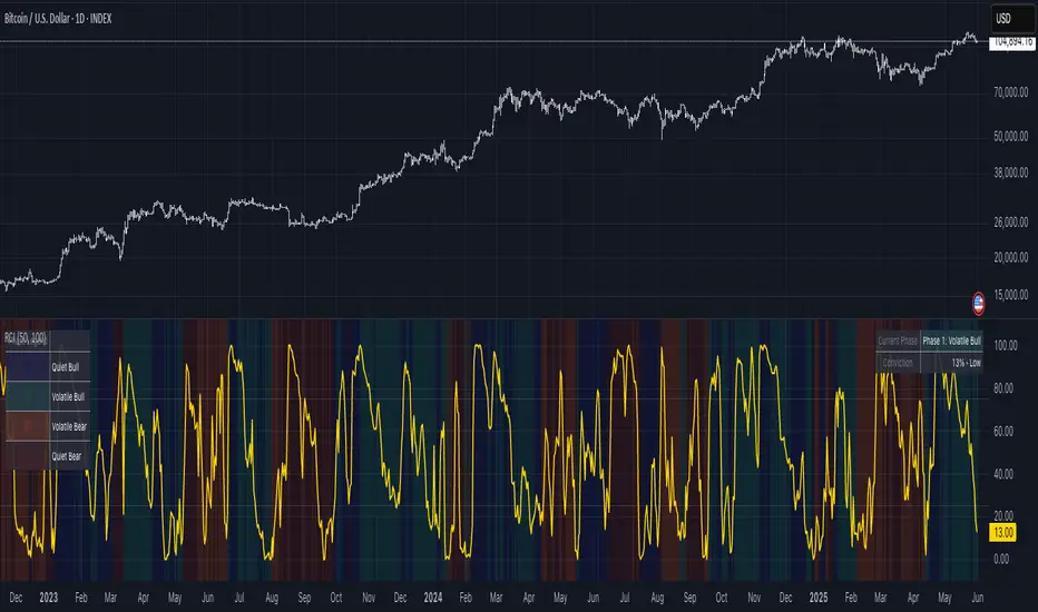Alongside identifying the phase, the indicator plots a "Conviction Index"—a clear gold line oscillating between 0 and 100. This index measures the strength and clarity of the current market phase.