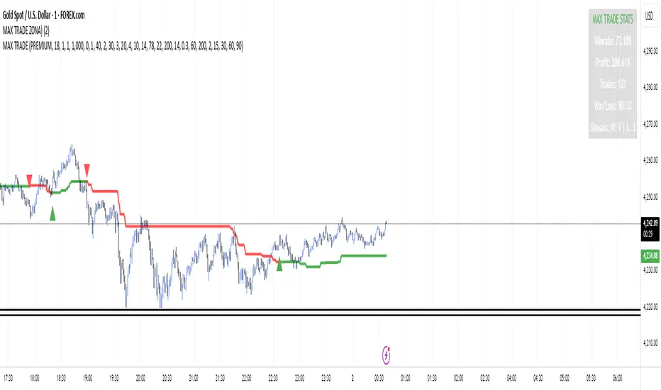 MAX TRADE is an advanced intraday trading indicator designed for gold and forex pairs. It uses a dynamic Fibonacci-based trend line, multi-timeframe EMA, RSI and ATR filters to avoid bad entries. Every signal comes with automatic TP/SL levels, break-even logic and a live stats panel showing win rate, profit, number of trades and streaks.