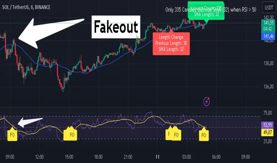 The RSI Fakeout Detection focuses on one key goal: avoiding false signals. By monitoring when the RSI exceeds a customizable threshold (indicating strength) but the price remains below a moving average like the SMA, this indicator highlights situations where the market may seem strong, but the price action doesn't support that momentum. In other words, it saves you from those tricky fake breakouts.