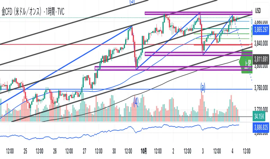 複数のEMAの傾きと位置関係から上昇/下降トレンドを自動検出し、